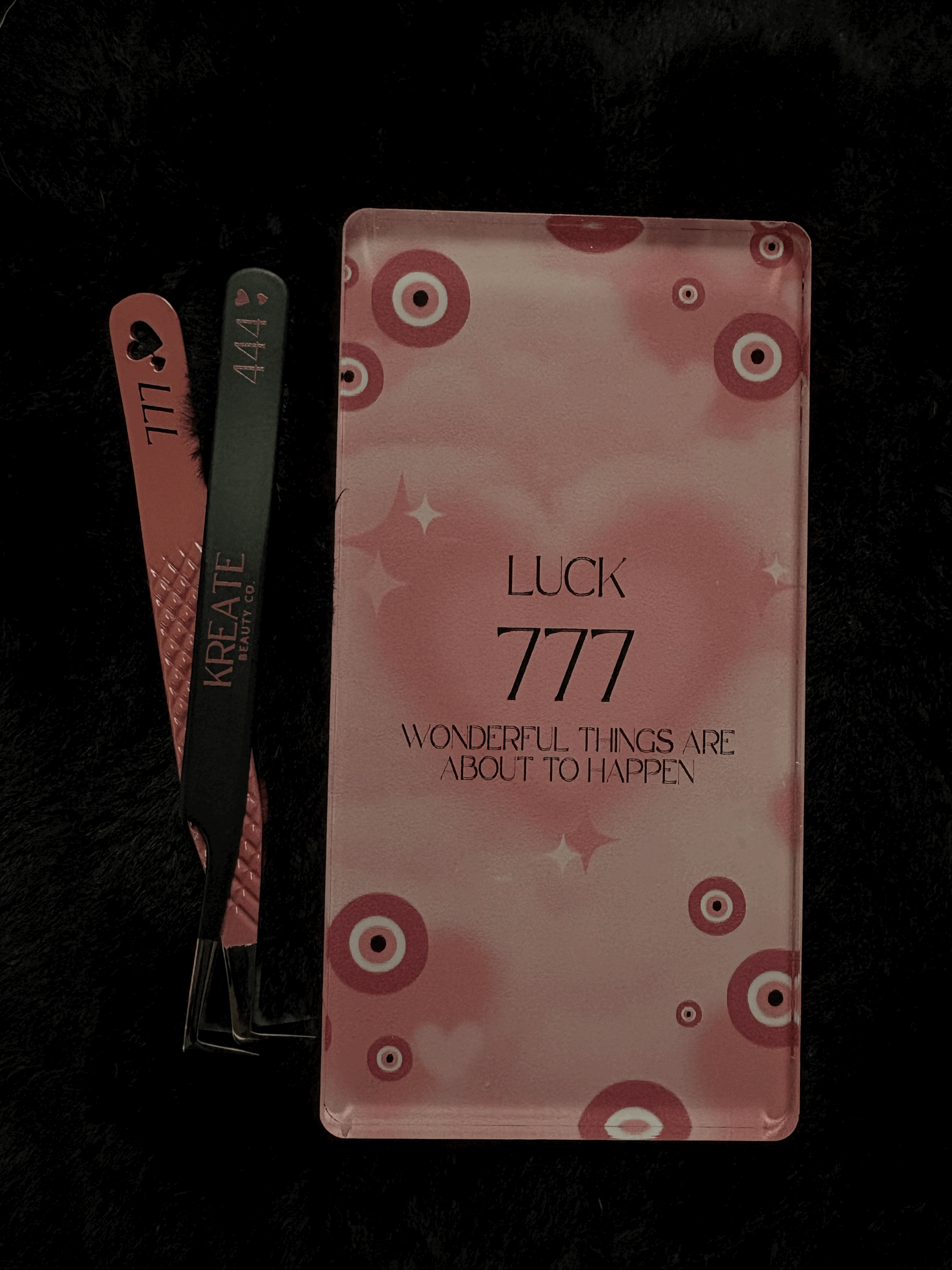 Fiber tip lash tweezers featuring an angel number theme, available in five distinct and elegant styles with matching acrylic tiles.